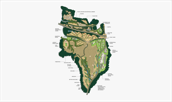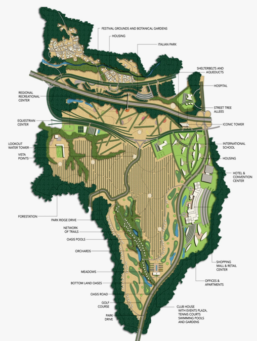 The property adjacent to the highway will be devoted to park uses: the planned Italian-government facilities will be enhanced by additional hiking and equestrian trails, and active recreation nodes; the pedestrian bridge over the highway will link the two areas.